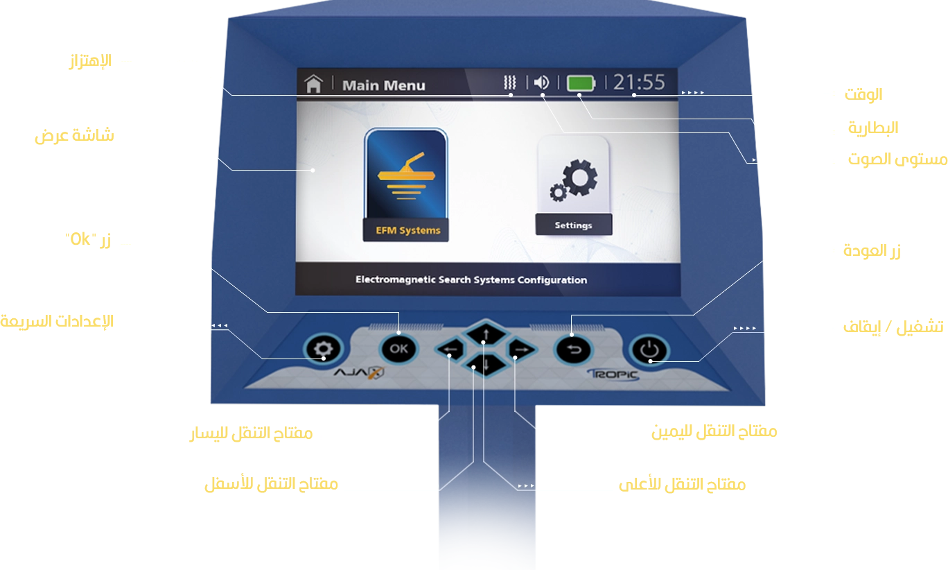مختص بالتمييز المطلق والدقيق بين أنواع الأهداف الموجودة تحت الأرض وإظهار نوعها وهويتها ، وقد تم تزويد جهاز تروبيك بنظام بحث فريد من نوعه و متعدد المزايا.